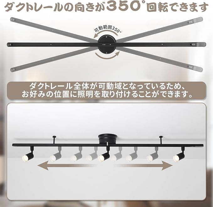 【可動範囲350度】天井に取り付けた状態で、ダクトレールは350 回転が可能です。この特性を活かせば、照明をお好きな位置に設置でき、理想的な明かりを演出できます。自分のライフスタイルにぴったりの照明を実現できます。