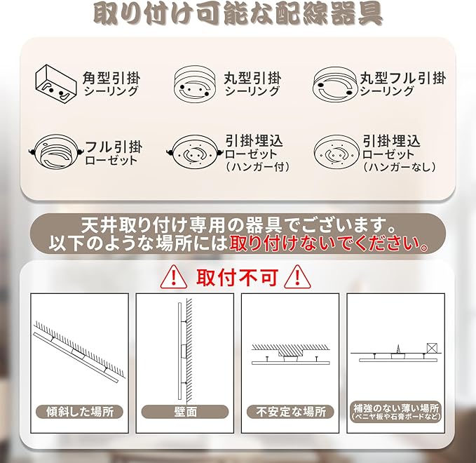 【工事不要&取付簡易】引掛シーリングに対応しており、天井に穴を開けず、一般的な家庭の天井に設置されている配線部品「引掛けシーリング」、「ローゼット」に直接取り付けることが可能です。電気工事を行うことなく、自分で簡単に取り付けることができます。