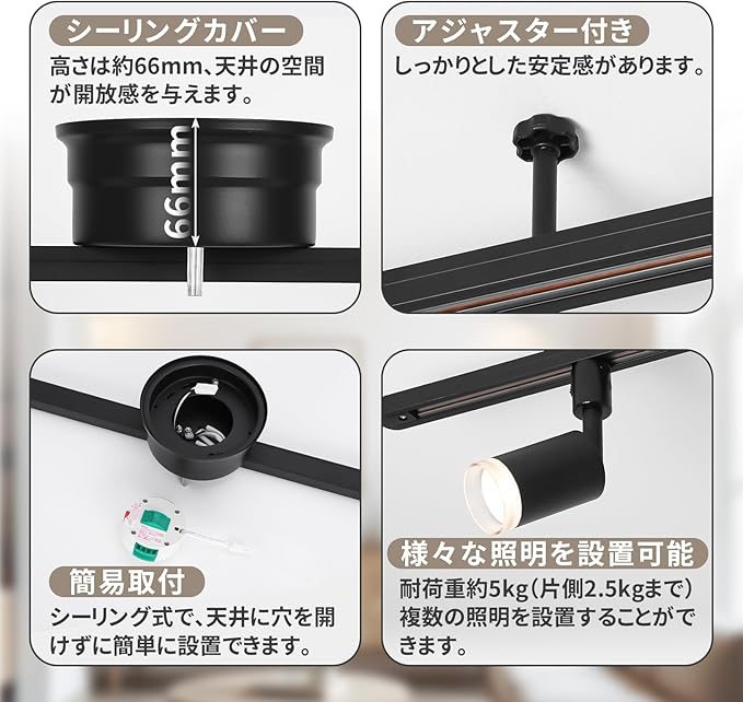 【仕様】全長:1.48m 重量:1.35kg 材質:鉄、アルミ カラー: 黒 (ブラック) 定格電圧/電流:AC100V 5A 500Wまで 取付け可能器具の総重量:最大5kgまで(片側2.5kgまで)