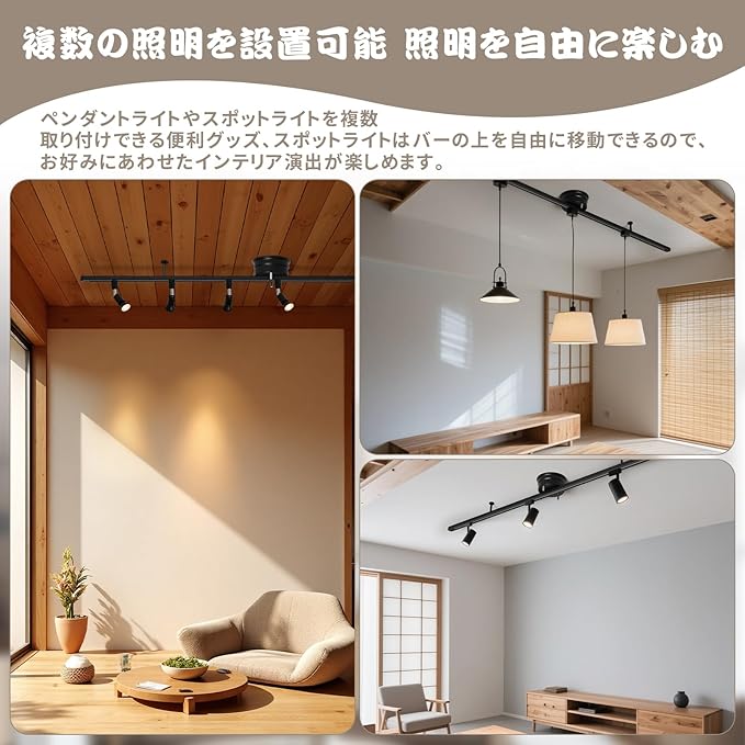 【照明を自由に楽しむ】ペンダントライトやスポットライトを複数取り付けできる便利グッズ、スポットライトはバーの上を自由に移動できるので、お好みにあわせたインテリア演出が楽しめます。デザイン性を重視したインテリア照明は、明るさに欠けるものが比較的多く、ダクトレールタイプの電源なら明るさが足りない場合は付け足す事ができ、明るさも確保しながらご家庭でいろいろなライティングを楽しむことができます。