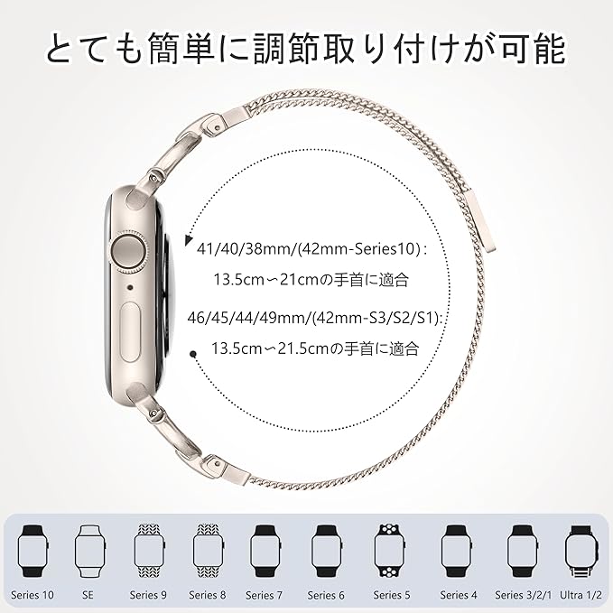 【対応モデル】このApple Watchバンドは、手首サイズが13.5cmから21cmに対応しています。42mm Apple Watch Series 10、41mm Apple Watch Series 9 8 7、40mm Apple Watch SE Series 6 5 4、38mm Apple Watch Series 3 2 1に適合します。(手首サイズの選択にご注意ください)