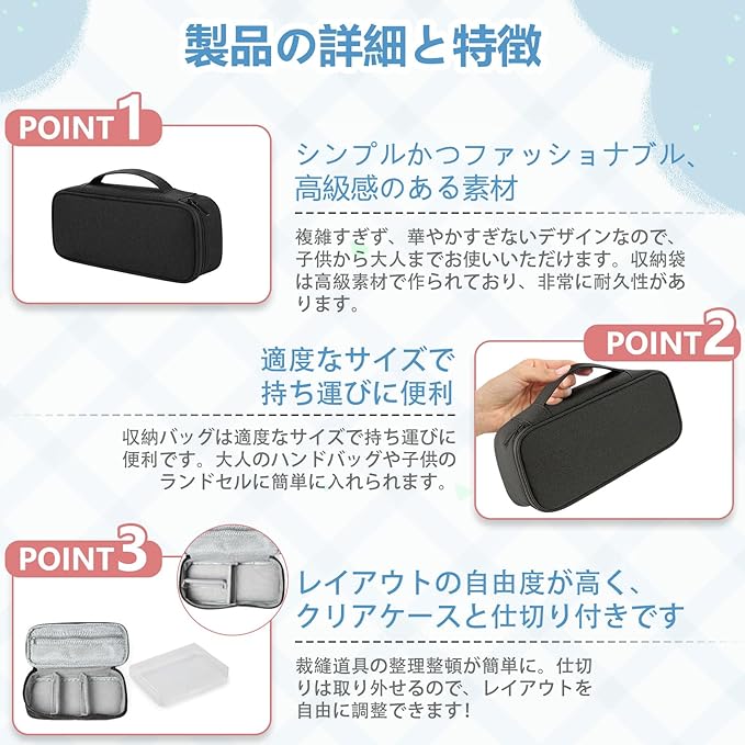 ✅【こだわりのポイント!】❶飽きのこないシンプルなデザインのバッグ。❷クリアケースと仕切り付きで整理整頓しやすい。❸裁縫道具 小学生 女の子 男の子 大人トラベルポーチやガジェットポーチとしても使えます。