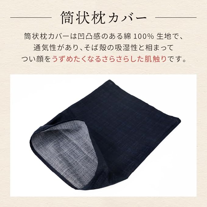 【材質】詰め物/そば殻、中当て/防虫不織布、筒型カバー・枕本体・側生地/綿、【生産国】そば殻生産・詰め加工・最終加工/日本(生地のみ中国)