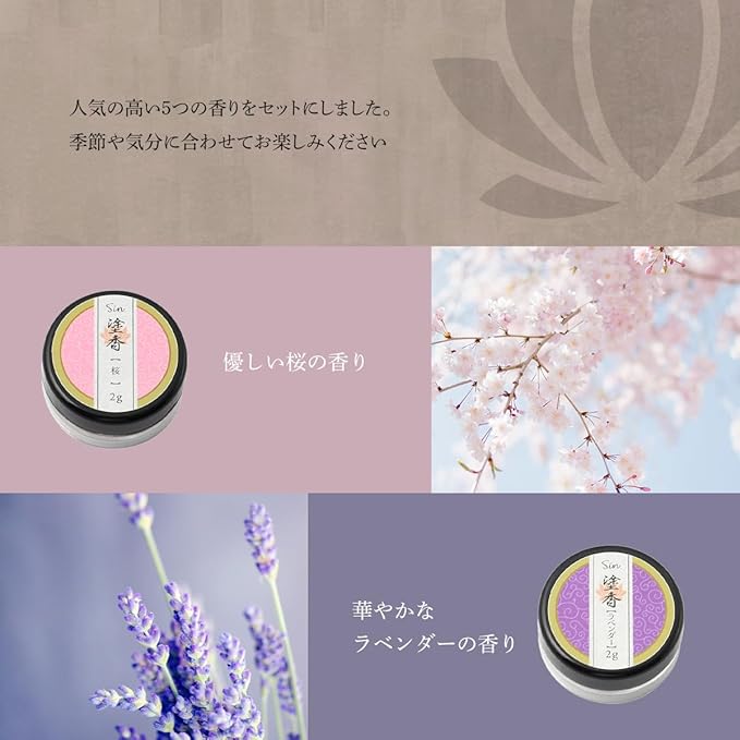白檀、クラシック、金木犀、ラベンダー、桜の5種の香り