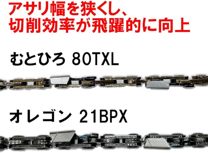 325"ピッチ、.043"(1.1mm)ゲージのソーチェーンです。軽量化によりソーチェンの回転を上げ、アサリ幅を狭くすることで切削効率が飛躍的に高まりました。