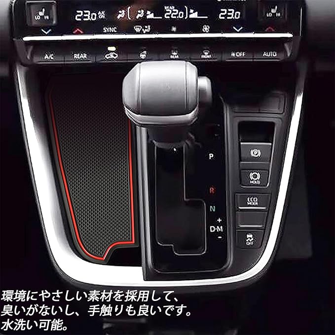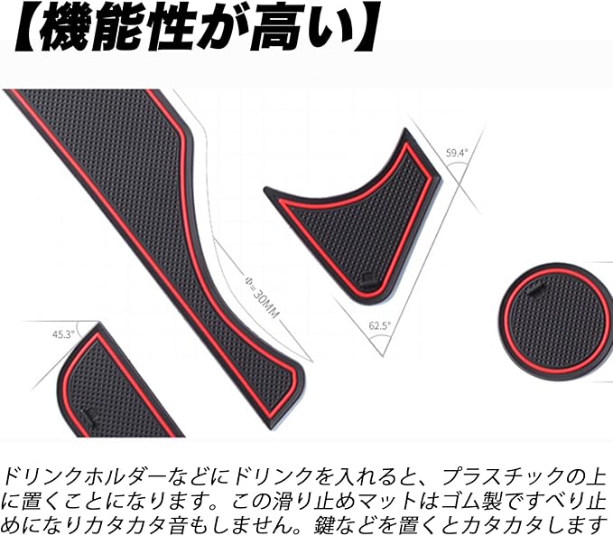 専用設計で完璧なフィッティングを実現。実際に車両に取り付けて、何度も微調整を行い商品化しているため、フィッティングはばっちりです。騒音防止、ノンスリップ、丸洗い可能な素材を使用。各ポケット、センターコンソール、ドリンクホルダーなどの汚れや傷を防止し、異音を軽減。室内をオシャレにドレスアップできます。ゴム素材は摩擦力の関係でホコリなどが付きやすいですが、水で洗えるのでお手入れ簡単。再度取り付ける際には、ゴムマットを十分に乾かし水分を取り除いてください。ノンスリップ処理を施し、ツルツルながらピタッと吸着してストレスなく使用可能です。