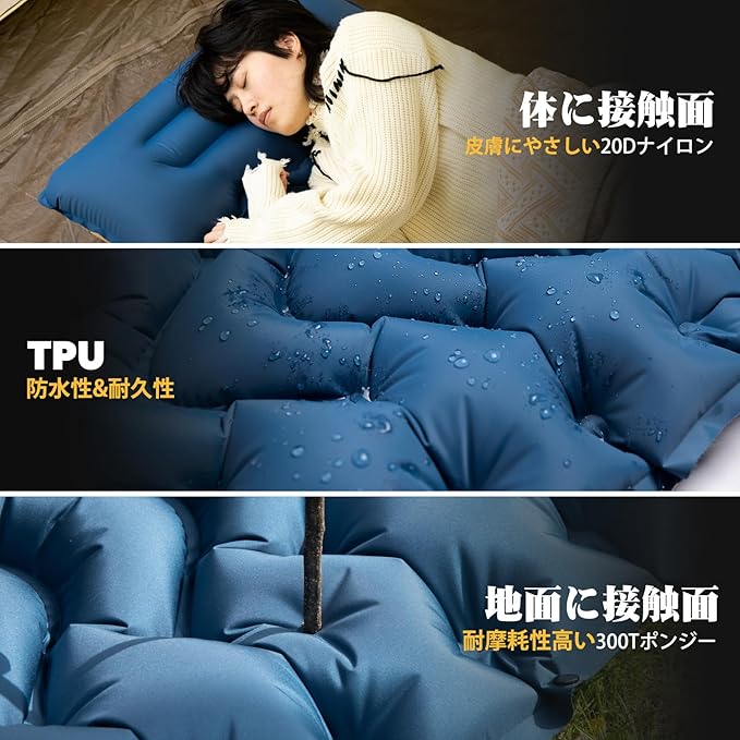 ⛺【防水素材・手入れも簡単】❶ エアーマット素材には、体に接触面は触感良い超軽量の20Dナイロン、地面に接触面は耐摩耗性高い300Tポンジー、空気が動く音や生地がこすれる音が少なく、朝までグッスリ眠れられます。❷ TPU内蔵の多層素材で水や汚れにも強い、汚れた場合は濡れタオルで簡単に拭き取ることができ、補修テープ3枚もついており、万が一の場合でも補修できます。