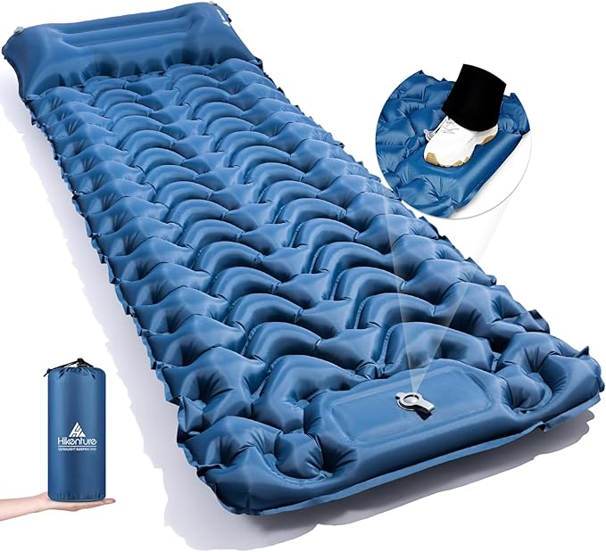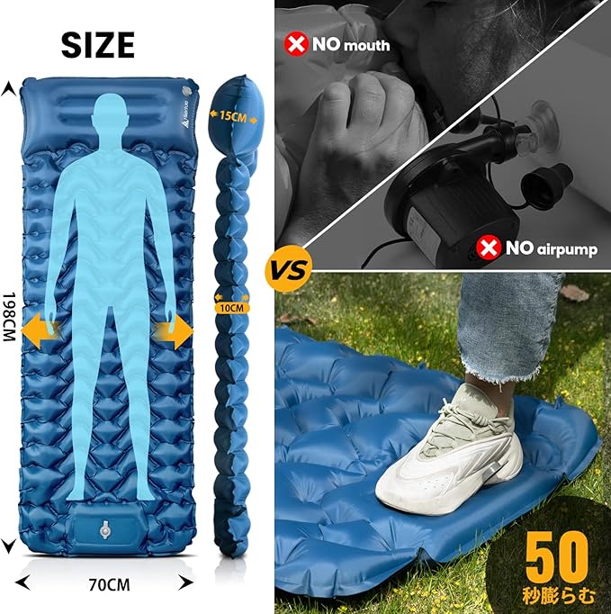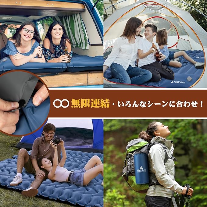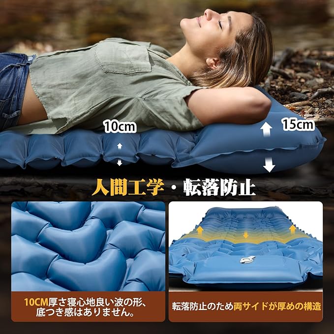 Hikenture エアーマット 足踏み式【10cm厚さ・50s膨らむ】無限連結 コンパクト 軽量 落下防止・両サイド厚め構造 防水防潮 収納ケース・ゴムバンド・補修テープ付 日本語取扱書 枕付き キャンプ マット エアマット 車中泊 キャンプマット テント アウトドア 防災 用 ドライブ ツーリング テント泊 山登り お花見 | oioioichan