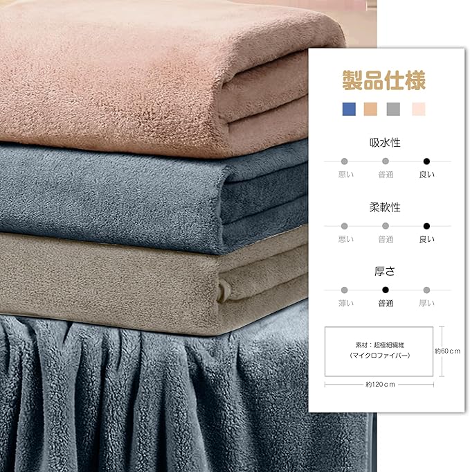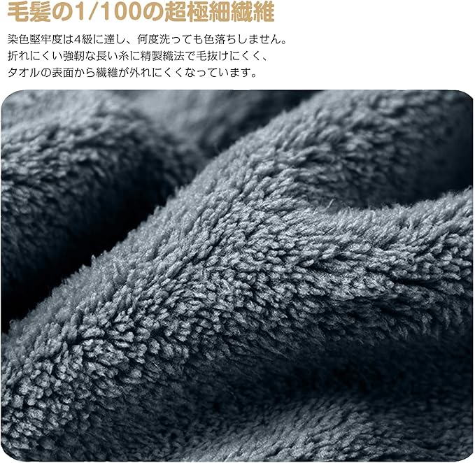 【極細繊維のマイクロファイバー素材】通気性があり、柔らかく快適な素材です。 通常のタオルよりも細番手の高品質糸を使用することで、繊細で柔らかな肌触りを実現しました。 ふわふわの起毛タイプなので、大人だけでなく赤ちゃんのお肌も優しく包み込みます。 特徴:吸水速乾、軽量、毛羽落ち防止、通気性が強く、静電気なし、蛍光なし。