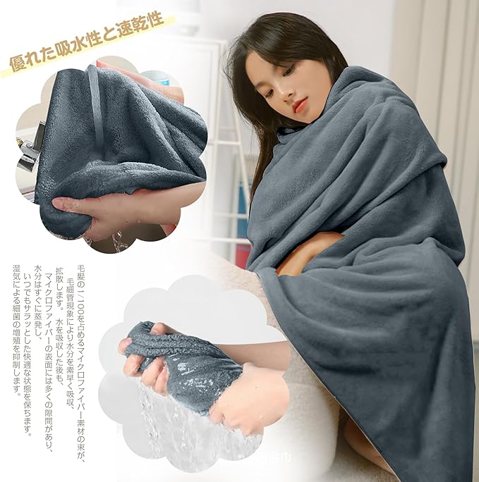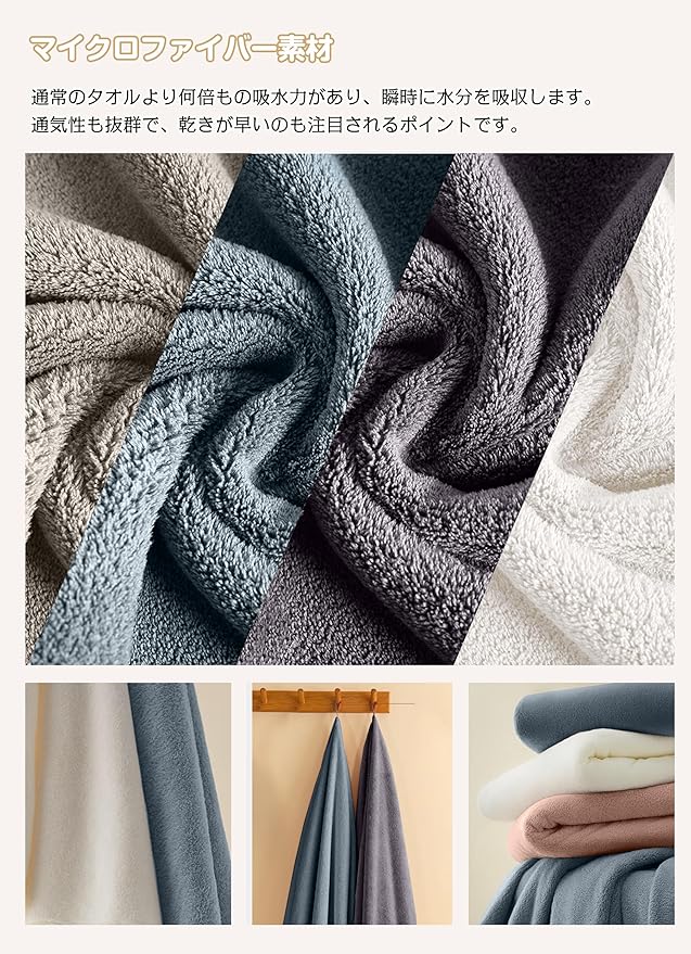 【優れた吸水性と速乾性】綿素材より優れた吸水性と速乾性。 マイクロファイバー素材の表面には無数の隙間があり、その隙間に大量の水を素早く吸収します。 髪や肌を軽く拭くだけで水分を吸収し、ホコリがつきにくいです。 バスタオルの隙間により、隙間に溜まった水分を空気が素早く拡散させるので、乾燥が早く、無菌で衛生的な状態を保つことができます。 梅雨や湿気の多い季節でも清潔を保ちます。 乾きにくい洗濯物にも快適にお使いいただけます。 室内干しも可能です。