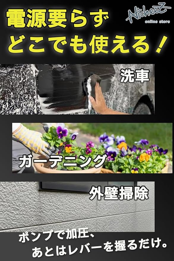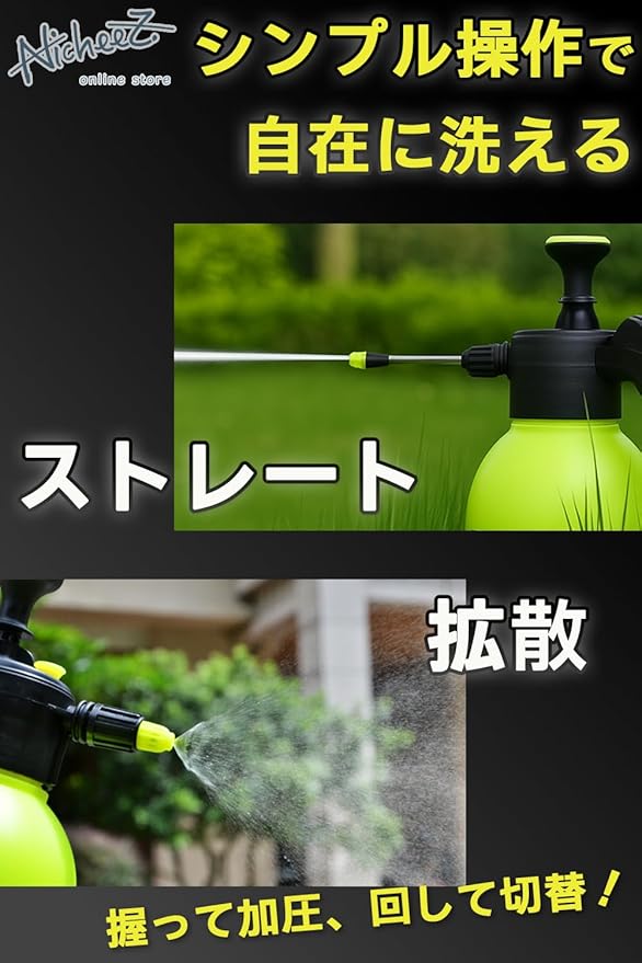 【ハンディ設計でどこでも使える】手動ポンプ式のコードレスなので電源を気にせず庭や駐車場でもサッと使えて、植物への散水や防虫スプレーも加圧噴射で均一に届きます。面倒な準備なしで暮らしのキレイとお庭のグリーンを気軽に保てます。拡散とストレートの2タイプの切り替えが可能。