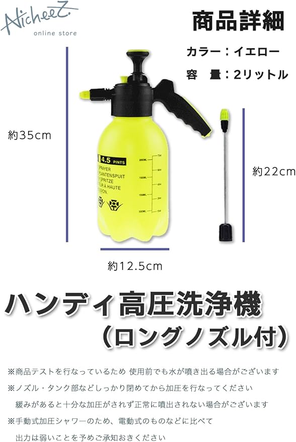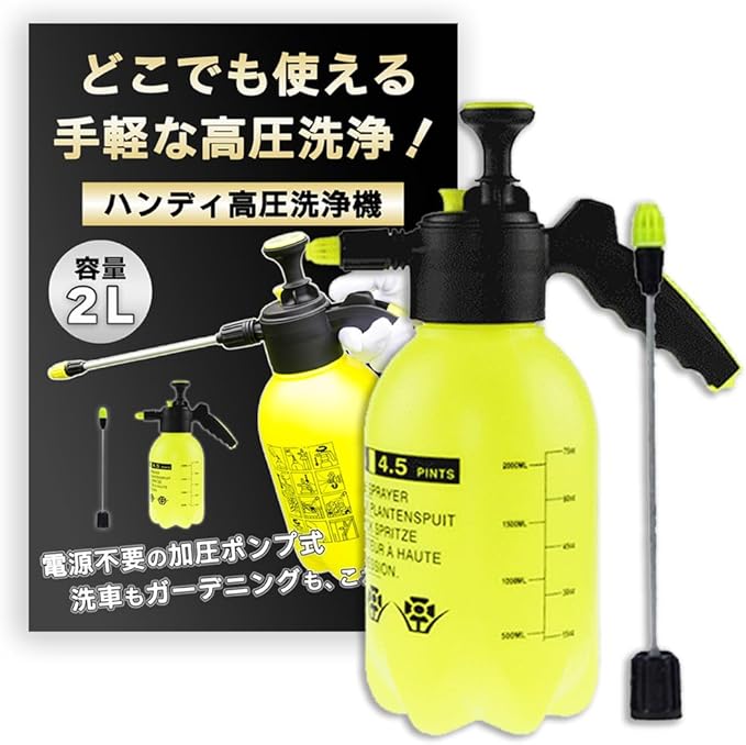 【商品内容】ハンディ高圧洗浄機 セット数:1個 カラー:イエロー 素材:ポリエチレン サイズ:縦/約35cm タンク直径/約12.5cm ノズル長さ/約22cm タンク容量/約2リットル ※ノズル・タンク部などしっかり閉めてから加圧を行なってください。緩みがあると、ノズル接続部からの漏れの原因や十分な加圧がされず正常に噴出されない場合がございます。また、必要以上の加圧は容器破損・水漏れの原因となります。手動式加圧シャワーのため、電動式のものなどに比べて出力は弱いことを予めご承知おきください。商品テストを行なっているため 使用前でも水が噴き出る場合がございます。