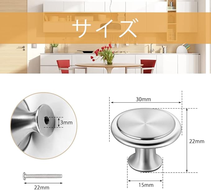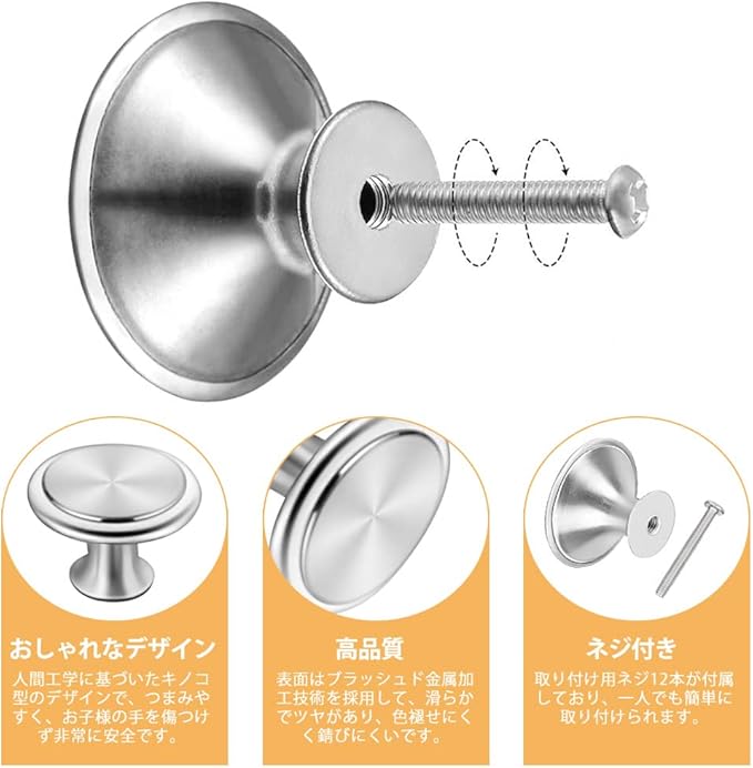 【12個セットで経済的】シルバーカラーの引き出しノブ12個と専用ネジ12本がセットに。直径30mm 高さ22mmのコンパクト設計で、140gと軽量。DIY家具の修理やリメイクに最適なコスパ抜群のキットです。
