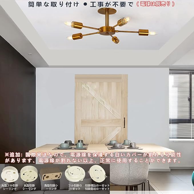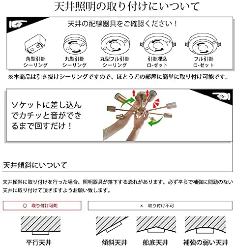 【簡単な取り付け】引掛けシーリング式なので、工事不要で素人にも取り付けられます。★★★ご注意:感電の恐れがありますので、取付・取り外す前に必ず部屋の主電源のブレーキを下がってください!!!※LED電球、白熱電球、電球型蛍光灯使用可。ご注意:傾斜のある天井、傾斜を合わせた舟底天井、凹凸のある天井ではご使用いただけません。必ず平らな天井に取り付けて下さい。