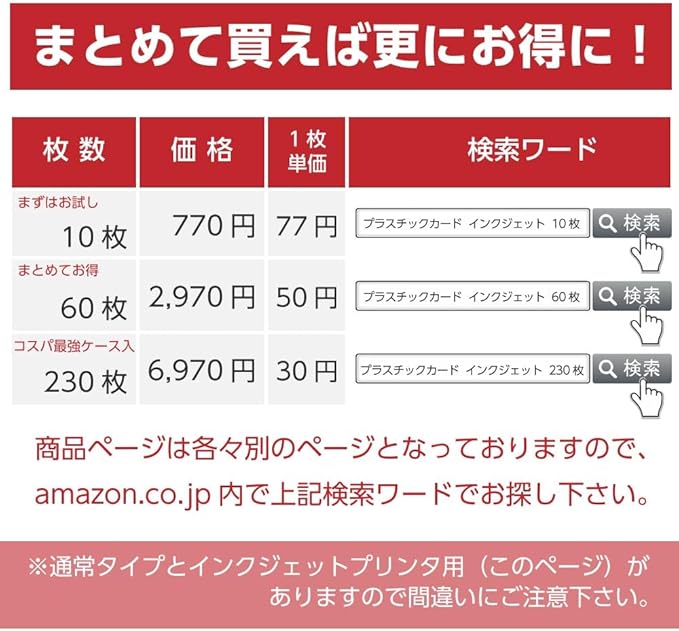 エプソン、キャノンのカード印刷可能なインクジェットプリンタに対応しますが、最適な印刷結果が得られるかどうかまずは10枚入りでお試し下さい。