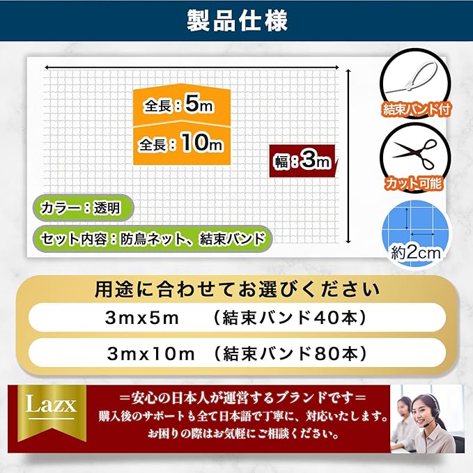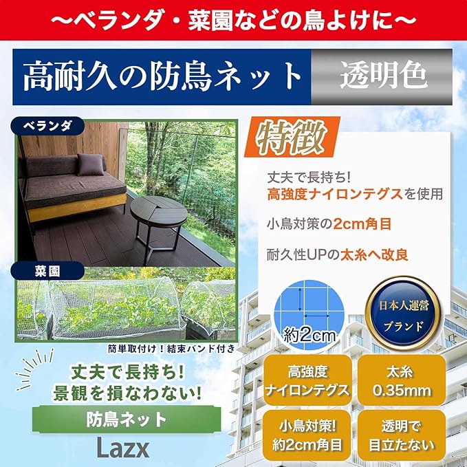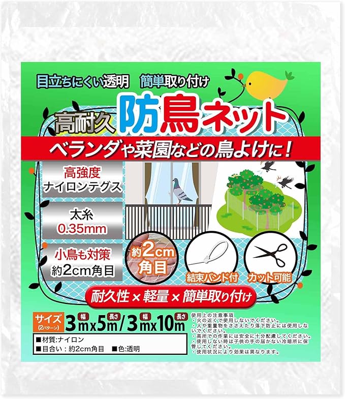 【こだわり】高耐久、小鳥対策、目立たず景観を損なわない透明色、結束バンド付きと利便性にこだわりました。防鳥ネットは鳥たちの侵入を防止する鳥よけネットとしての利用の他にも、ペットの猫や鳥などの家からの脱走防止としても利用できます。