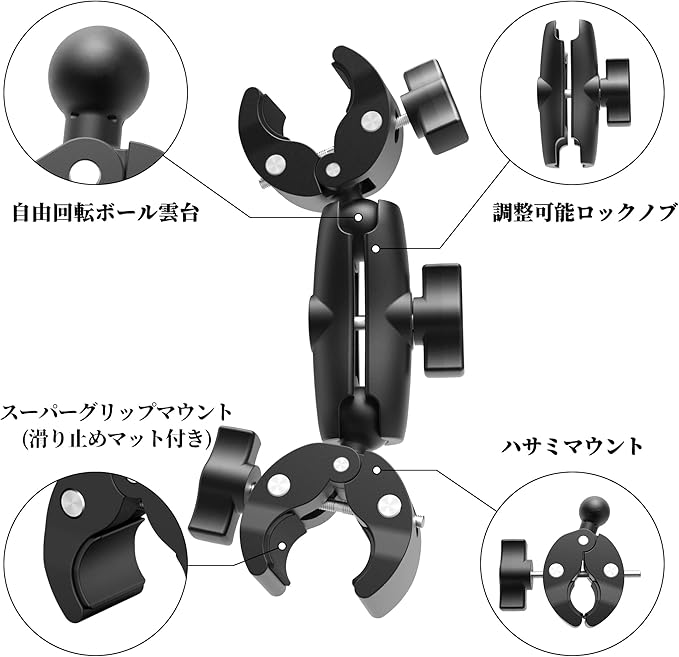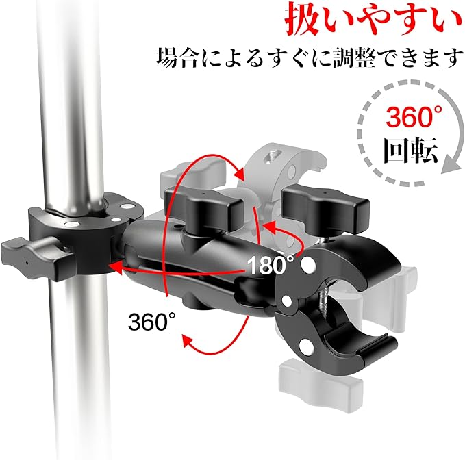 【ダブルクランプマウント】ダブルボール雲台+ダブルクランプの組み合わせで場所や用途に応じて大活躍できます。ダブルボール雲台によりクランプ両方も360度回転できて、縦でも横でも自由変換可能です。