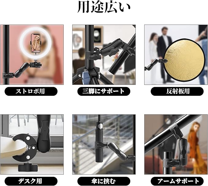 【多用途】クランプの開け口は最大3.96cmまで拡大されます。室内撮影に限らず、アウトドア活動なども活用できます。両端とも挟んで、パイプや傘などの接続に役立ちます。