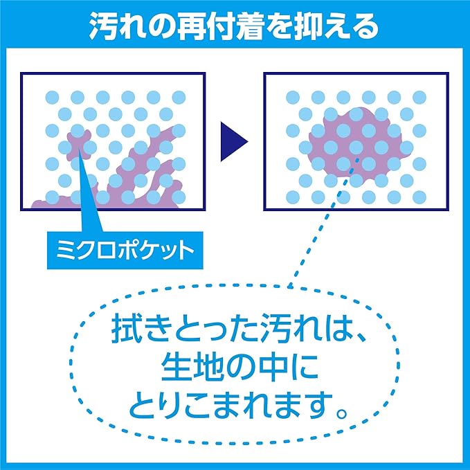 トレシーの超極細繊維(約2μm)が拭き取り面に密着し、「ミクロポケット」(繊維の隙間)に汚れを取り込み除去。