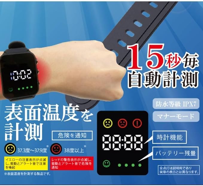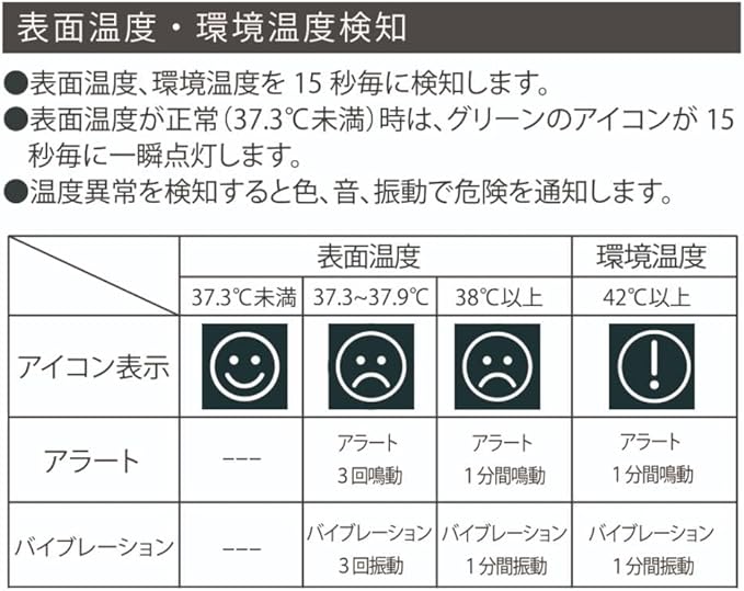 37.3度~37.9→イエローの注意表示が点滅し、振動とアラート音で注意を喚起! 38度以上→レッドの警告表示が点滅し、振動とアラート音で危険を通知。※表面温度を計測する製品です。
