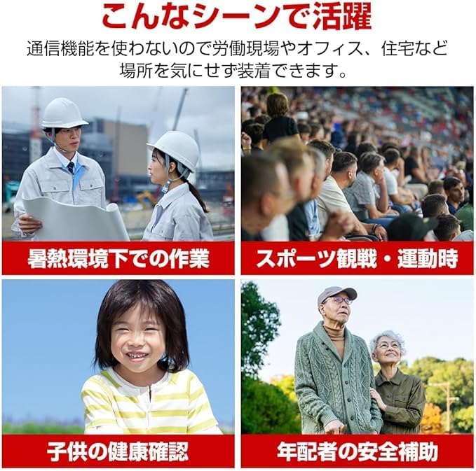 本製品は本体裏面センサーで15秒ごとに自動測定(またはリアルタイム測定)を行い、暑熱リスクをLED発光・アラート音・バイブレーションの3方式で通知。装着者の安全確保をサポートします。