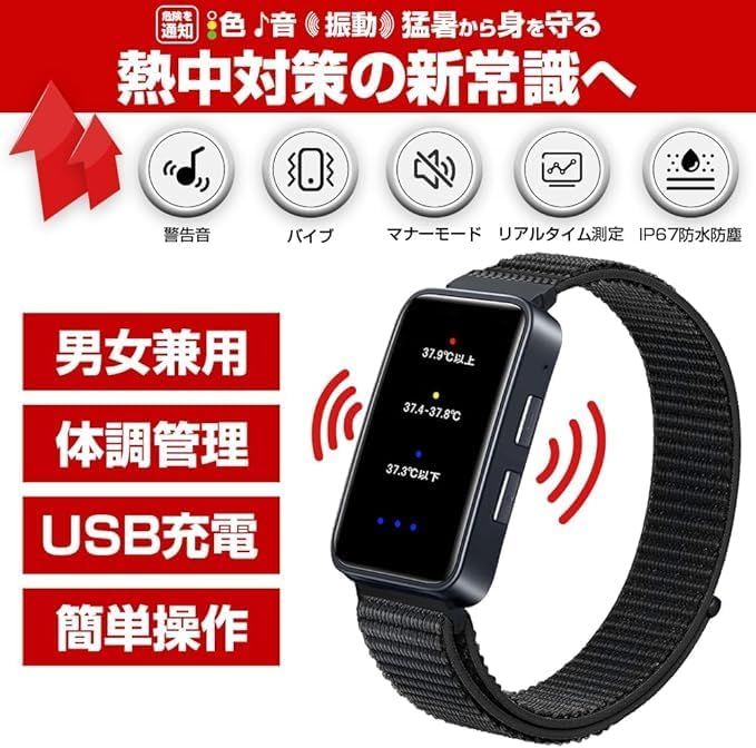 ◆本製品は本体裏面センサーで15秒ごとに自動測定(またはリアルタイム測定)を行い、暑熱リスクをLED発光・アラート音・バイブレーションの3方式で通知。装着者の安全確保をサポートします。