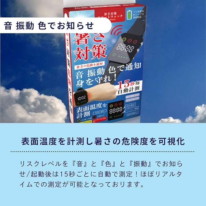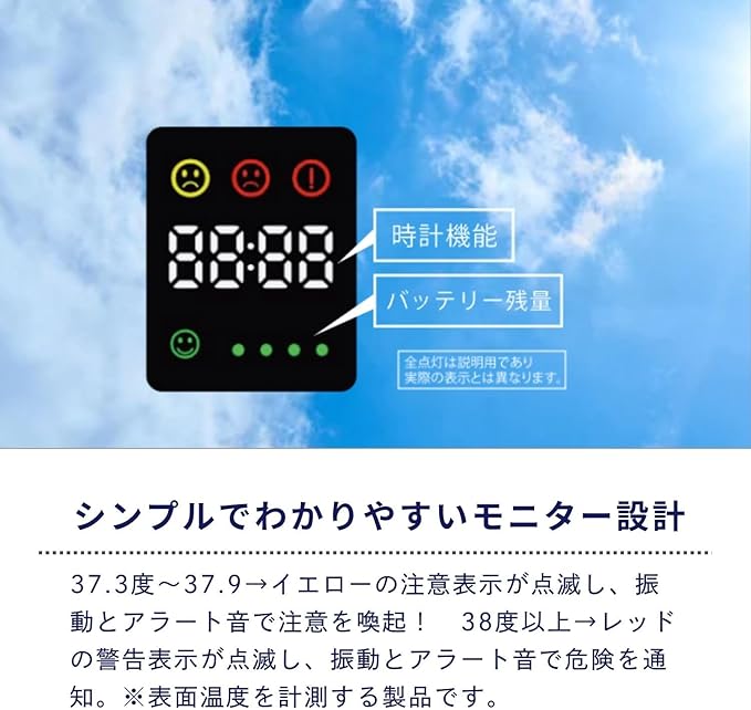 37.3度~37.9→イエローの注意表示が点滅し、振動とアラート音で注意を喚起! 38度以上→レッドの警告表示が点滅し、振動とアラート音で危険を通知。※表面温度を計測する製品です。