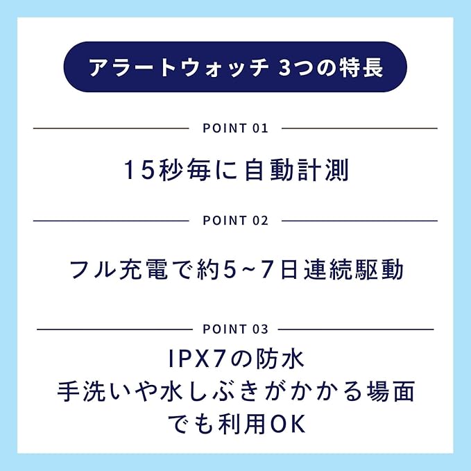 リストバンド型なので労働現場やオフィス、住宅など場所を気にせず装着できます。さらにIP67の防水・防塵機能なので、お風呂やプールなどを除き、ほとんどの日常の環境でご使用いただけます。