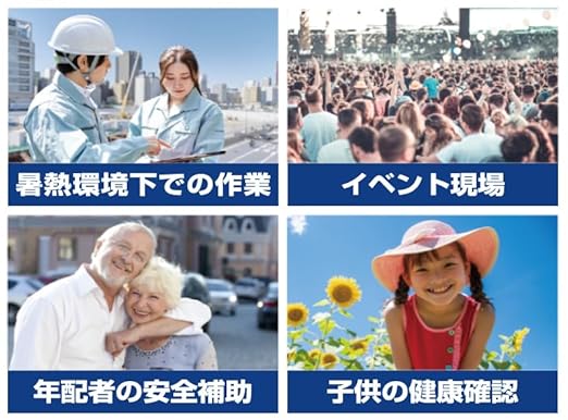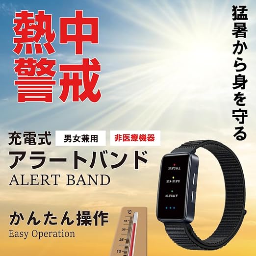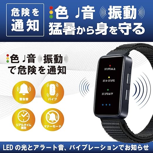 【商品説明】設定は一切不要!巻くだけ簡単、熱中症を予防!腕時計のように手首に巻くだけで熱中症の危険を通知します。15秒毎の自動測定で体表温度を色、アラーム、振動で通知。(※マナーモードにも設定可。)安心の防水防塵仕様(IP67)でベルトは丈夫で耐久性の高いナイロン素材。2時間の充電時間で最長4日間連続使用できます。アウトドア、暑熱環境下での作業でも安心して使用できます。年配者にもオススメです。