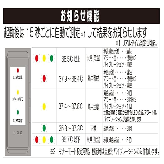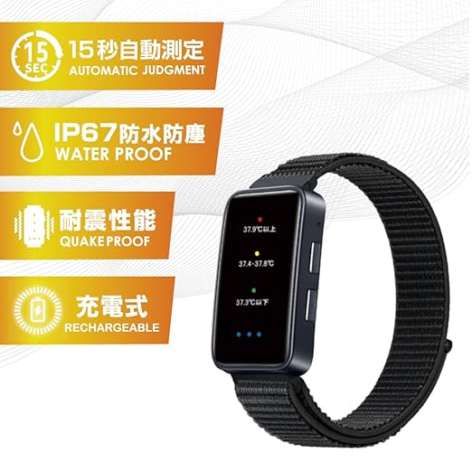 【機能】自動測定(手動も可)/色と音と振動で体温通知/防水(IP67)/マナーモード