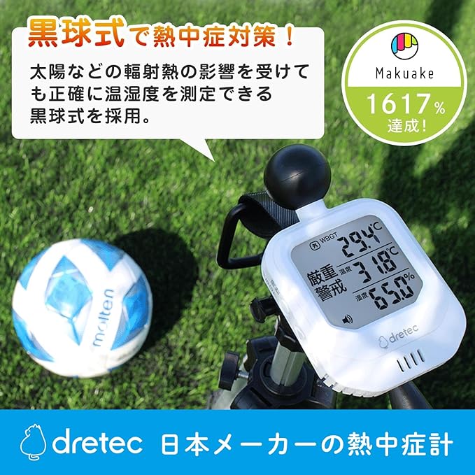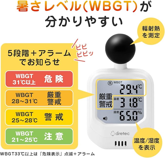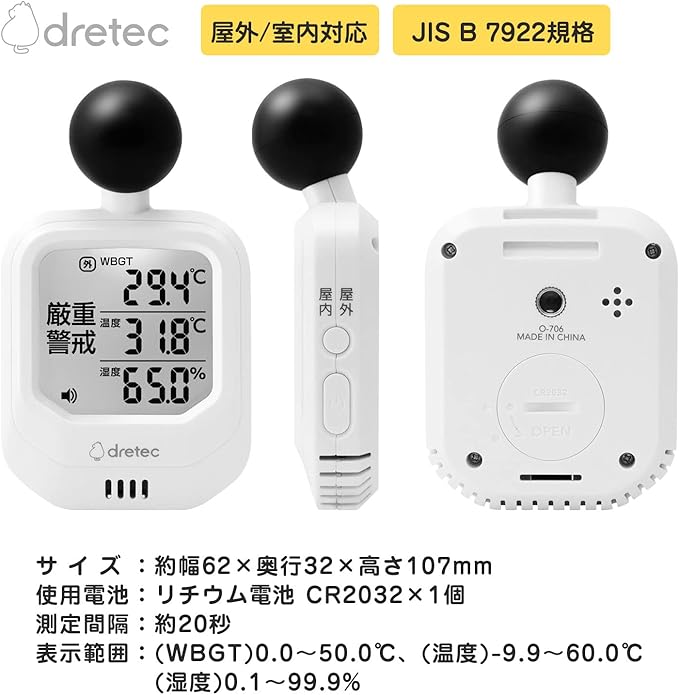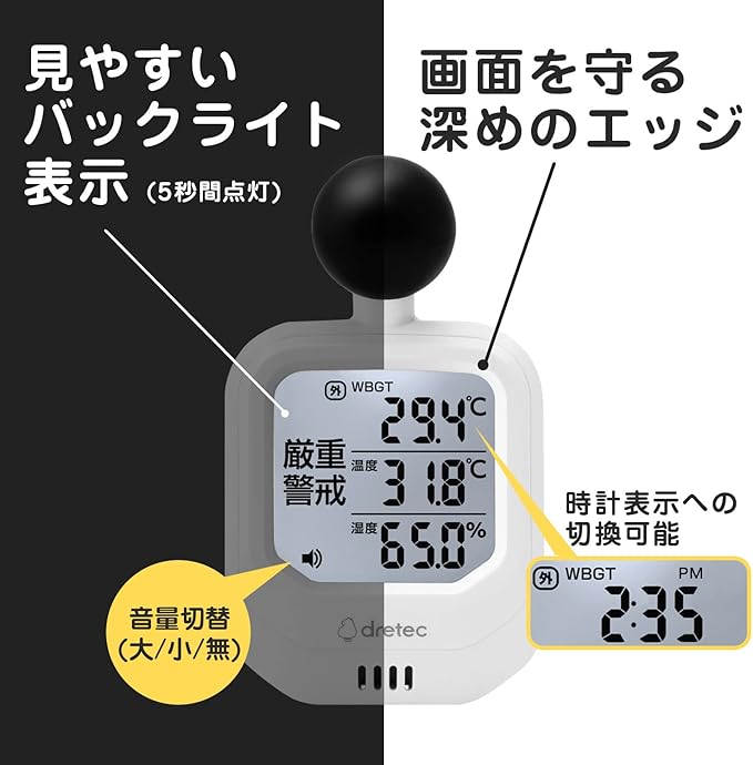 ドリテック(dretec) 【熱中症対策】黒球式熱中症計 温湿度計 時計付き 熱中症指数 WBGT アラーム バックライト 消音 室内 屋外 デジタル 日本メーカー JIS B 7922:2023 適合品 | oioioichan
