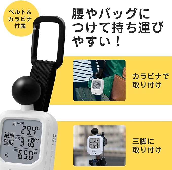 太陽などの輻射熱の影響があっても正確に計測ができる黒球式温湿度計です。熱中症対策として取り入れられている暑さ指数(WBGT)を表示します。