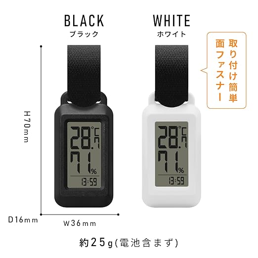 寸法:約W36 D16 H70(mm)/質量:約25g(電池含まず)/防滴仕様:JIS C 0920 IPX4/使用電池:リチウム電池CR2032 1個/電池寿命:約1年/表示範囲:温度-9.9~50.0℃湿度10~99%/精度:温度0.0~40.0℃ 1.0℃ その他の範囲 2.0℃ 湿度50~80% 5% その他の範囲10%/測定間隔約5秒間