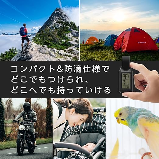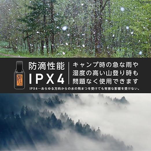 【防滴仕様/高精度センサー搭載】高湿度の環境や高温・低温度域での厳しい環境でも高精度で耐久性の高いセンサーを搭載。5秒間隔で測定するので、今の数字がすぐに確認できます。アウトドアやスノーボードなど幅広い場面で使えます。また、突然の雨で水滴が本体にかかってしまっても安心して使える防滴設計です。日常生活で水がかかるようなシーンなら問題なく使えるIPX4相当です。