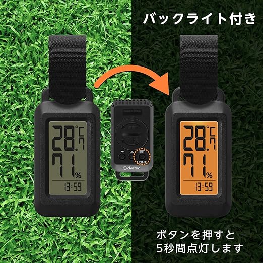 【携帯できる温湿度計】暑い日差しの中でのお買い物、凍てつくような寒い日の外出など、お出かけするときの気温・湿度は気になるもの。ポータブル温湿度計は小さくて持ち運びにぴったり!様々なものに取り付けられるバンド付き。赤ちゃんや高齢者がいるご家庭やアウトドアなど幅広いシーンにおすすめです。※日常生活の温度・湿度の目安としてご使用ください。氷点下時の屋外、直射日光の当たる場所では使用しないでください。