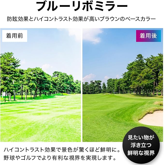抜群のファッション性と防眩効果。視界を鮮明に:景色をくっきりと見せるハイコントラスト効果の高いブラウンカラーを採用(外観はブルーで景色の見え方はブラウンカラー)。ボールや路面の状況が見やすくなります。まぶしさをカットする効果も高く、アウトドアのあらゆるシーンで活躍。