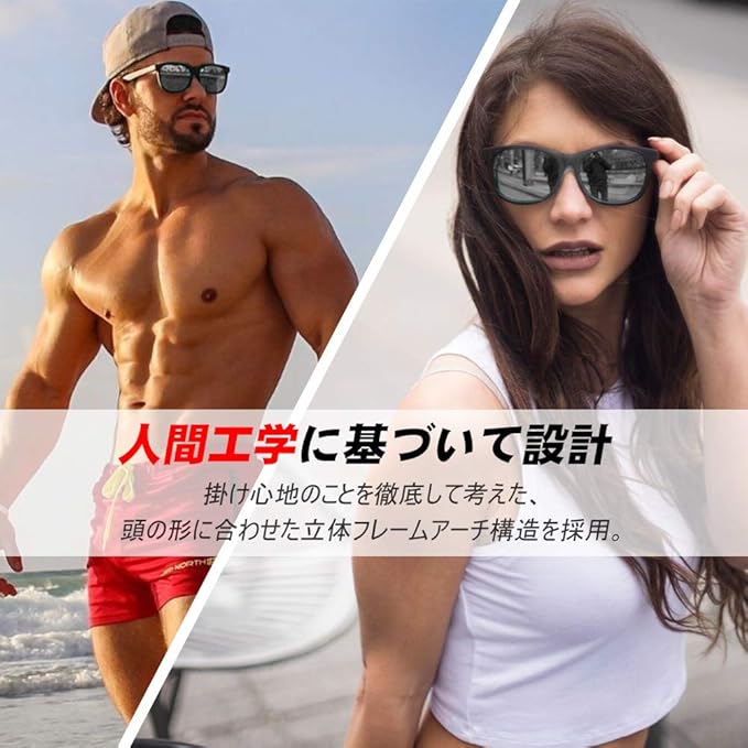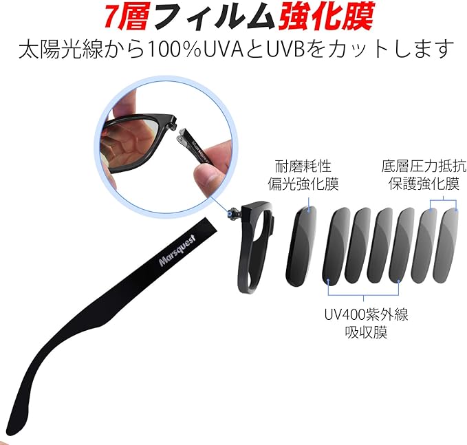 【7枚4層コーティング技術加工した偏光レンズ】偏光レンズは偏光膜という特殊フィルムが挟み込まれている特殊レンズです。表面に特殊な七つコーティング技術加工しています、1枚目の層は、偏光層です。2、3枚目の層は、耐久性を増すために、層を結合しています。4、5枚目の層は、紫外線を吸収するUV保護層です。6、7枚目の層は、飛散防止層です。UVA・UVB・UVC&目に有害なブルーライトを100%カットします。眩しさや乱反射光を効果的にカットし、より快適な視界を確保することができます。