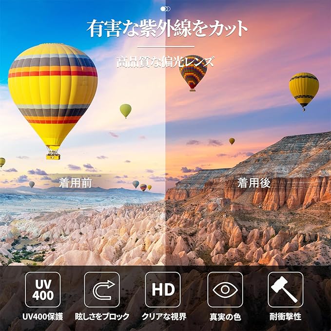 100% UV400保護:全てのサングラスがUV400保護を提供し、99%以上の紫外線を効果的に遮断し、強い光や紫外線から目を守ります。