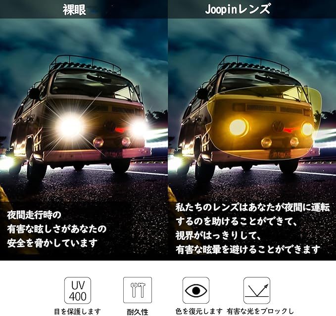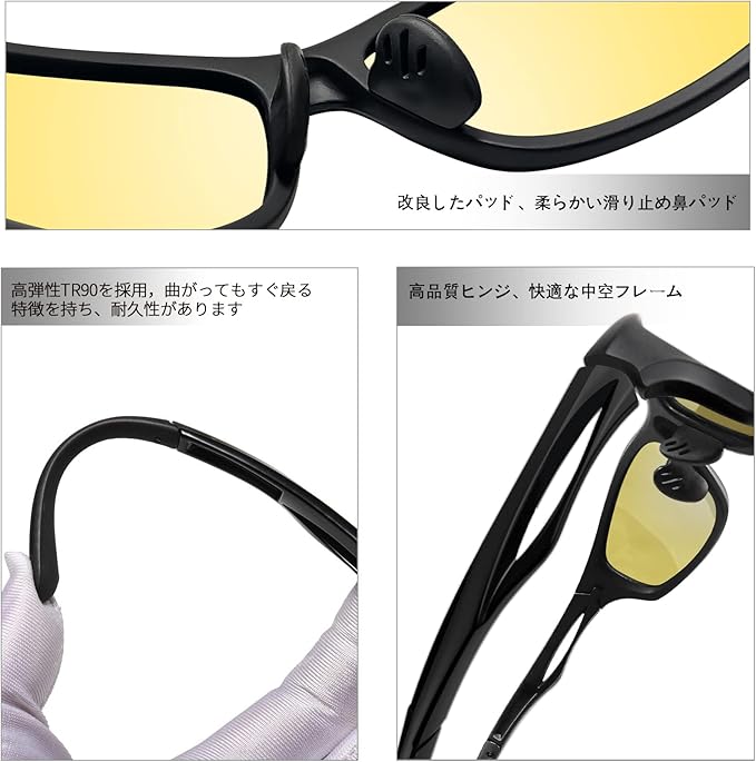 【機能性高いTAC黄色レンズ】暗視グラスは、反射フィルムと吸水性フィルムの特殊遮光素材を用い、コントラストアップ効果で対向車のヘッドライトのまぶしさを抑えながらも、しっかりとした明るさを確保できます。夜間や悪天候時でも視認性を損なわずに運転可能です。夜間だけでなく昼の強い紫外線や乱反射もカットしてくれます