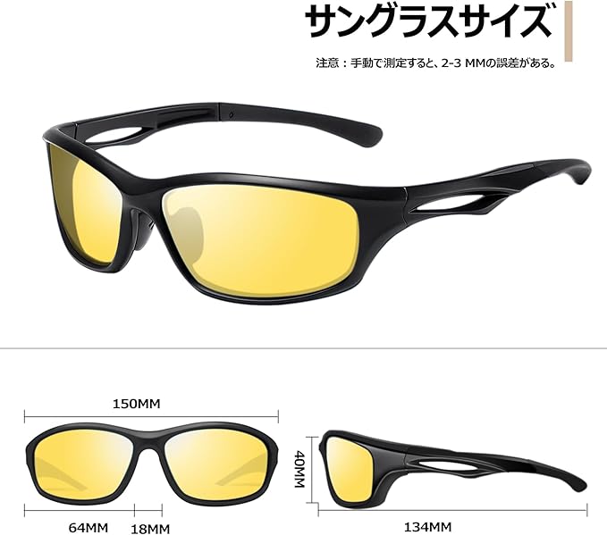 【商品仕様】フレーム幅:150㎜;レンズ幅:64㎜;レンズの高さ:40㎜;ブリッジ:18㎜;アームの長さ:134㎜;重量:22g;レンズの測定サイズにはメガネフレームは含まれません。メンズ スポーツサングラスは、登山、スポーツ、ランニング、自転車、ドライブ、釣りなどのシチュエンにも非常に適しています