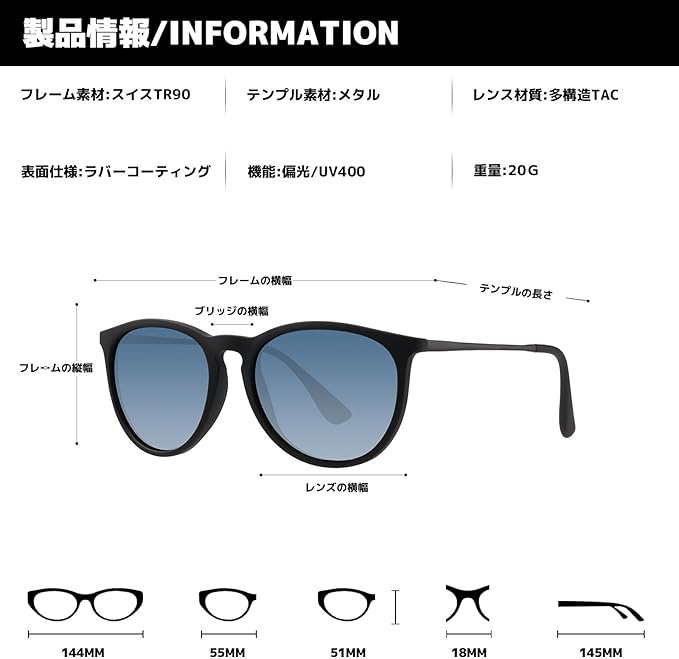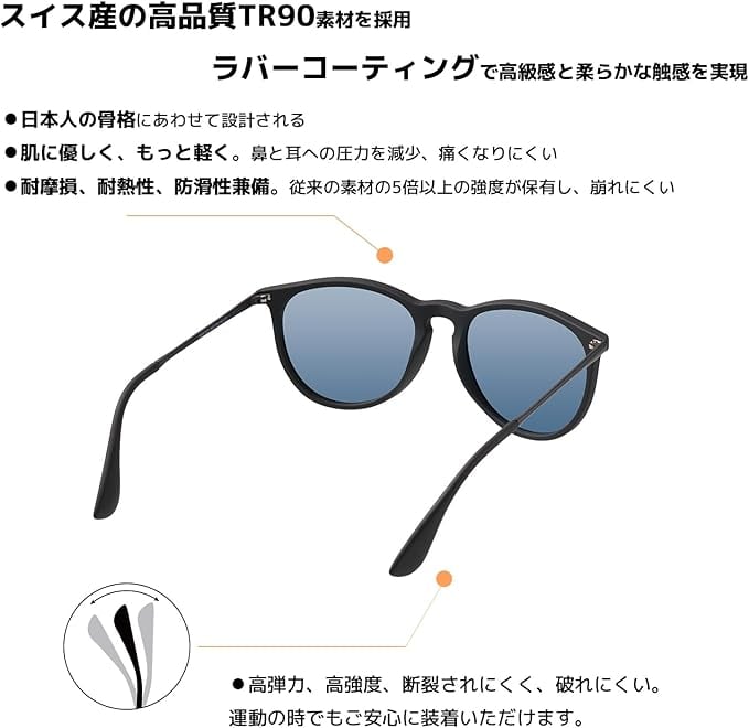 【素材構成】 フロント:超軽量TR90 レンズ:高品質プラスチック/偏光/UVカット率99%