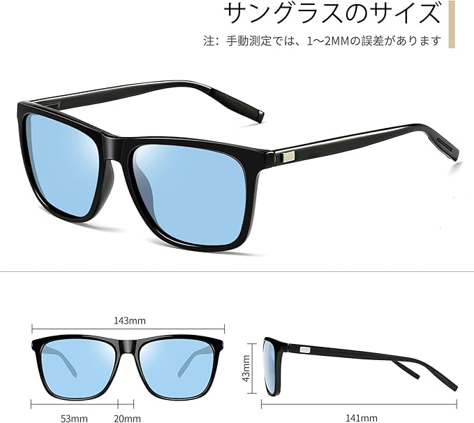 【商品仕様】フレーム幅:143㎜;レンズ幅:53㎜;レンズの高さ:43㎜;ブリッジ:20㎜;アームの長さ:141㎜;重量:22g;レンズの測定サイズにはメガネフレームは含まれません。メンズ 偏光サングラスは、登山、スポーツ、ランニング、自転車、ドライブ、釣りなどのシチュエンにも非常に適しています