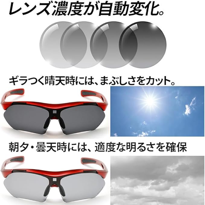 紫外線の量に応じてレンズ濃度を自動調節。晴天時はまぶしさを解消し、曇天時には必要なあかるさを確保。全天候でクリアな視界を確保できます。※当サングラスのレンズは紫外線の量で濃度変化するため、ドライブでご使用いただく場合はフロントガラスのUVカット機能でレンズ濃度の変化が小さくなります。お車の運転では視界がクリアな偏光サングラスとしてご活用ください。