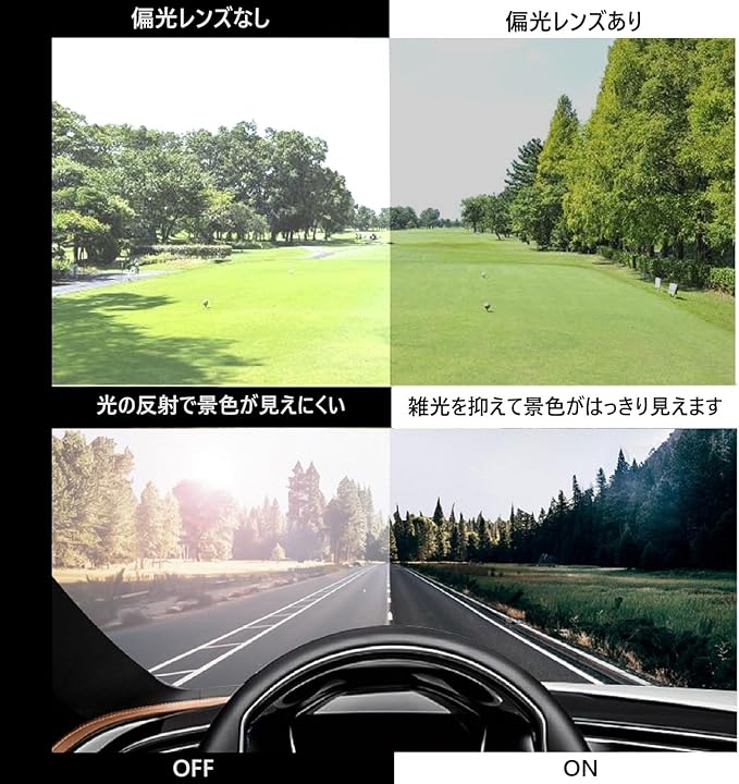 【偏光レンズの特徴】 偏光レンズは雑光を吸収するため、明暗のコントラストがつき、運転時の景観の輪郭がはっきりします。また、路面や水面やゴルフ場の芝面などの反射光を抑え、まぶしさを和らげるレンズです。