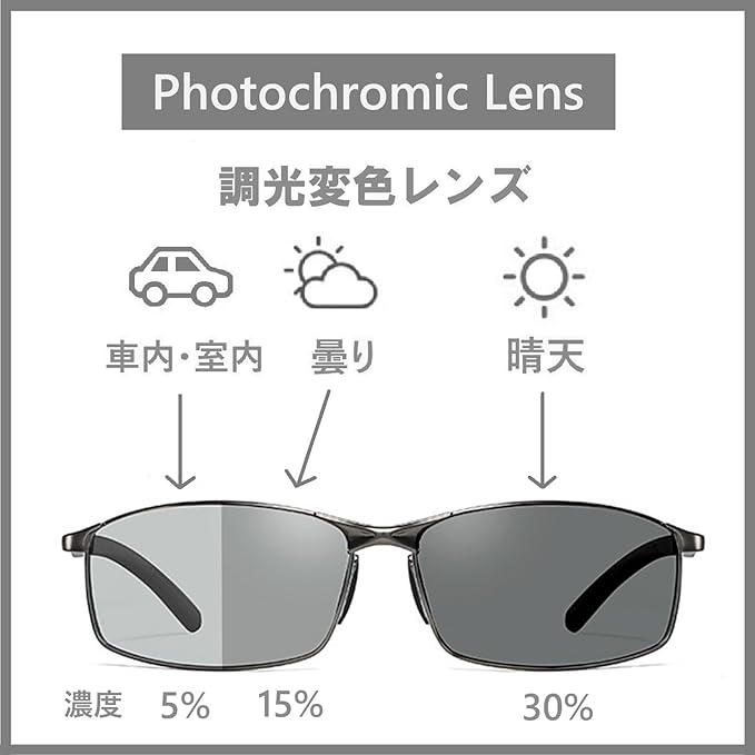 【調光変色レンズの特徴】レンズが紫外線に反応して濃色に変色します。通常濃度10%から晴天時30%程度の変色をいたします。この変色度合いであれば運転時トンネルなどの急な変化にも安心です。UVコーティングにより94%の紫外線をカットいたします。 (変色は紫外線量によります。また、変色するには太陽光下で1~2分かかります。)