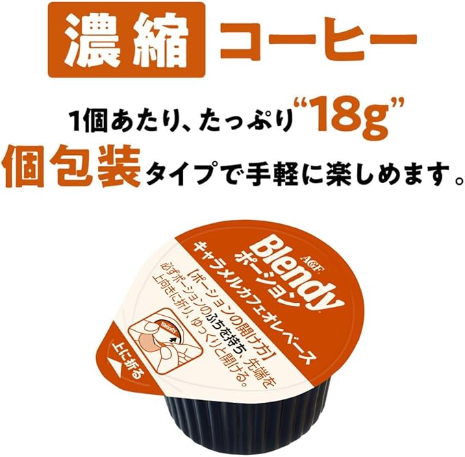 おいしい飲み方:使用方法:7~9倍に薄めてお飲みください。1、「ブレンディ」ポーションコーヒーを入れます。2、冷たい牛乳か水を150ml注ぎ、よくかき混ぜてお召し上がりください。※温めた牛乳やお湯、豆乳、アーモンドミルクなど、お好みの飲み方でお楽しみください。