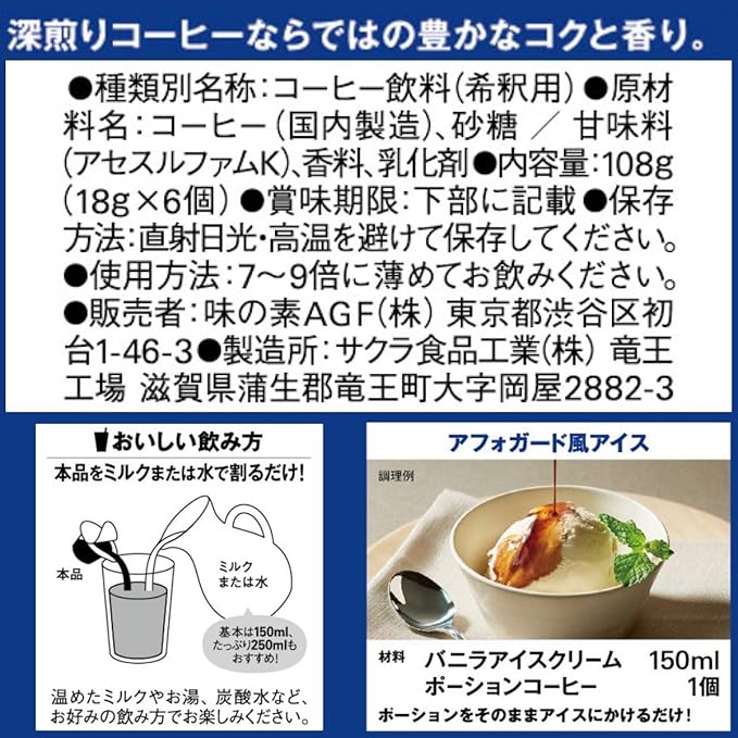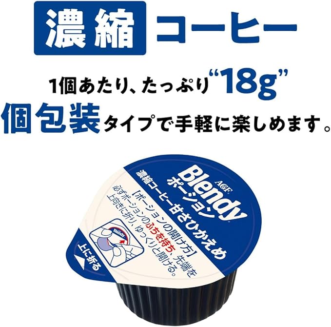 おいしい飲み方:使用方法:7~9倍に薄めてお飲みください。1、「ブレンディ」ポーションコーヒーを入れます。2、冷たい牛乳か水を150ml注ぎ、よくかき混ぜてお召し上がりください。※温めた牛乳やお湯、豆乳、アーモンドミルクなど、お好みの飲み方でお楽しみください。