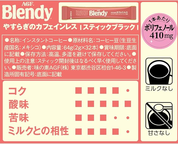 おいしい飲み方:【ホットの場合】:スティック1本にお湯または温めた牛乳(140~180ml)を注ぎ、よくかきまぜてください。【アイスの場合】:冷たい水または牛乳(140ml)にスティック1本を個直接入れ、よくかきまぜてください。