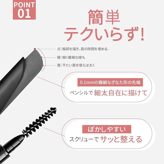 ■[2wayペンシル]ペンシルの一方は極細のなぎなた芯、なぎなた(薙刀)形とはまさに、薙刀のようなシルエットの平べったいペンシルのこと。肌に当てる角度によって、太いラインと細いラインが簡単にコントロールできる、もう一方はスクリューブラシがセットされたデュアルエンドタイプで、眉を描きながらブラシでぼかしたり、毛並みを整えたりと、これ1本でナチュラルな美眉を作ることができる。