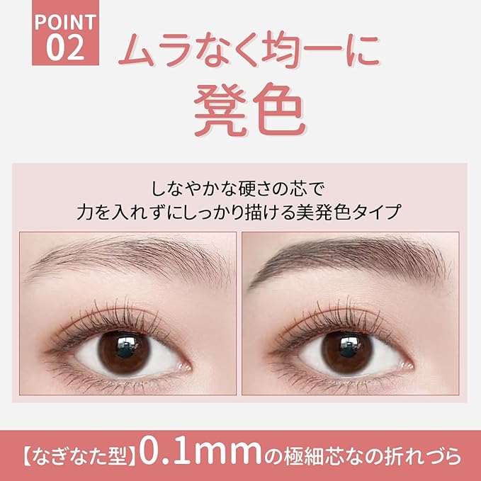 ■[汗・水・皮脂に強く]ウォータープルーフフォーミュラ、なめらかテクスチャの添加で、汗・水・皮脂に強く、メイク長持ち。なめらかな描き心地で自然でムラの無い仕上がり。美しい仕上がりが持続。